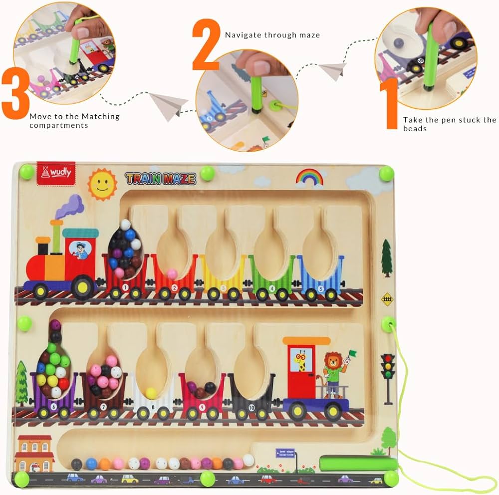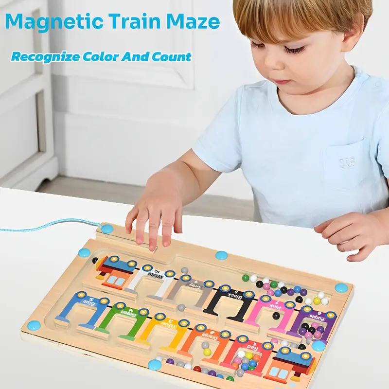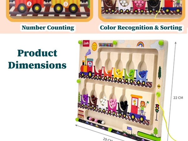 • Elevate early learning with our wooden magnetic maze, designed to make numbers and colors come to life. The magnetic pens and 55 colorful beads (in 10 different hues) transform counting into a delightful task.